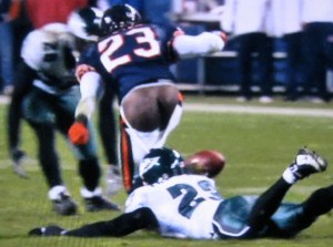 Offensively we were awesome. Forte ran for 117 yards – the most by anyone against Philly this year. The Butler was 14-21 for 247 yards, 4 TD’s and 0 INT’s for a career-best QBR of 146.2. He was sacked 4 times, but our line played well overall for the fourth straight game, showing promise that we may have just figured out this whole blocking thing. The Eagles led the league in takeaways but the Bears didn’t turn it over once. The one negative: Taylor ran for -3 yards, bringing his average down to 2.6 per carry. I propose we stop handing him the ball. Let’s see what Seven Hester had to say about Philly’s defense: