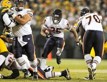 Despite Bell fumbling twice (one on the goal line that was recovered by Edwin Williams for a Bear TD, and the one that was re-recovered by McCown), that’s not too shabby for a guy who’s been so low on the depth chart that he couldn’t even see the field from his seat on the bench.  Both Barber and Bell have now had 100 yard games in Forte’s stead, which doesn’t bode well for Forte.  I’ve never thought he was an upper echelon back.  A lot has changed since we lost Cutler, but not much change has occurred since Forte went down.