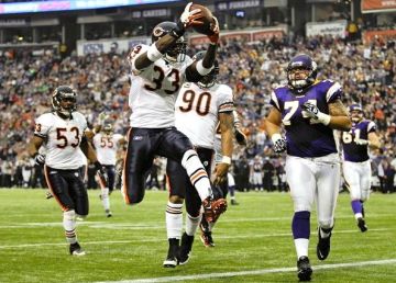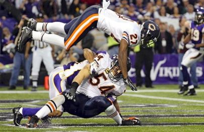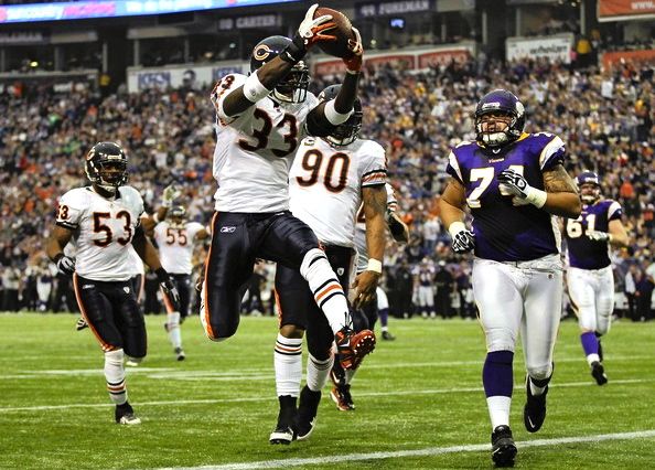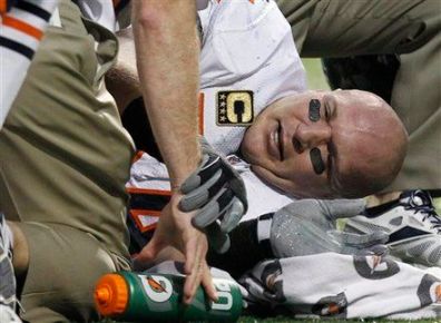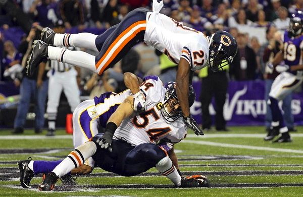For the second time this year, a safety went over Urlacher’s back on a pass in the end zone and it ended badly. The first time Conte knocked the ball out of Urlacher’s hands into a KC receiver’s hands for what turned out to be the game winning TD. But this time Wright not only knocked the ball out of Urlacher’s hands, but he came crashing down on Urlacher, and helped him sprain his medial collateral ligament and partially sprain his posterior cruciate ligament. Good thing we don’t have any games left because if we lost our defensive QB, it would probably end our season. Wait, what?