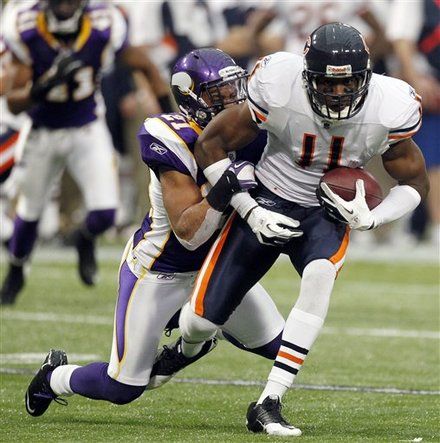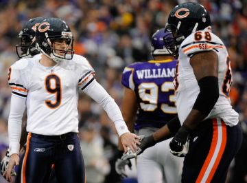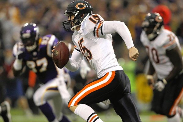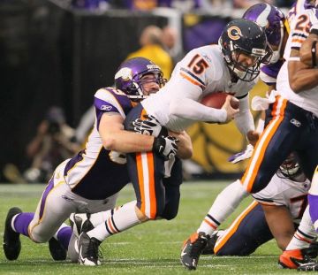 We amassed a whopping 209 total net yards, probably the all-time low for a dome/fair-weather win in NFL history (not counting Tebow, of course). We also turned the ball over 3 times. We fumbled twice in our first 7 plays (Kahlil “Yo Quiero Taco” Bell and “My Name Is” Earl Bennett), both of which gave Minni the ball in Bear territory, and both of which led to Minn scores. And then McCown threw a late pick, though it didn’t lead to any points. We were also sacked 7 times – after not getting sacked once in GB last week. Crazy, right?