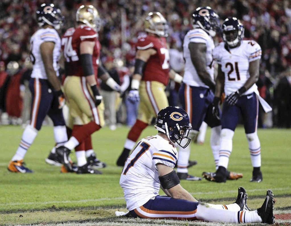 You can add Jason “I Fucking Suck” Campbell to the long list of shitty Bear QB’s.  We had -1 yard passing at the half, and finished with only 58.  Before our last possession of the first half, Campbell was 2 for 6 for 9 yards, 1.5 yard/attempt, 3 sacks, 0 TD’s, 1 INT, and a QBR only 2.8 points higher than the number of presidential elections Mitt “I Am The Bears O-Line Of Politics” Romney has won.  At that same time, Colin Kaepernick (who?!) was 12 for 15 (80%) for 184 yards, 12.3 yards/att, 1 sack, 1 TD, 0 INT’s and a whopping 140.0 QBR.