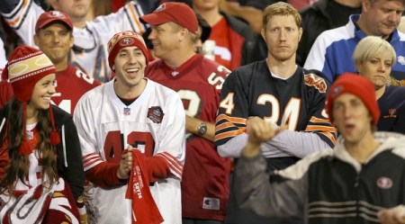 Miss Kara (my friend who was at the game in SF):  “There was this overweight lady Bears fan standing in the middle of the bathroom vomiting on her Bears poncho while her SF friend rubbed her back…and that was only the start of the second quarter.  That game would make any fan barf on their poncho.”