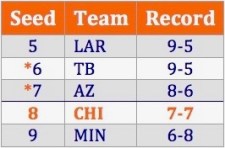 The 1st Wild Card (the #5 seed) is already out of reach because it’s owned by the Rams (9-5). The best we could do is tie them, and they’d take the tie-breaker because they already beat us this year.  The 2nd WC (the #6) is held by Tampa (9-5), who also has a 2-game lead on us.  But since we beat them, we would take the tie-breaker from them.  But to tie them, we’d have to win our final 2 games (@JAX and GB), and they would have to lose both of theirs (@DET and ATL).  That’s a pretty long shot, especially considering Brady and the Bucs will be fighting for their own playoff lives.  But it is one way the Bears could get an invite to the dance.